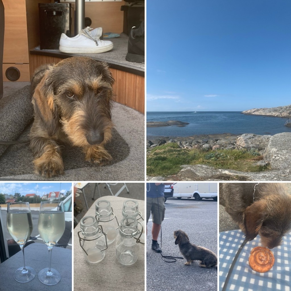 Diskar borta vid servicehuset och sedan lite inköp på Bolist (små snäppflaskor till kommande husbilsdrinkar). H tar en tur med Vespan för att upptäcka öarna och köpa korv till lunch.Sen kaffe å wienerbröd innan d blir min tur att upptäcka ön, fast jag med Kicklas.