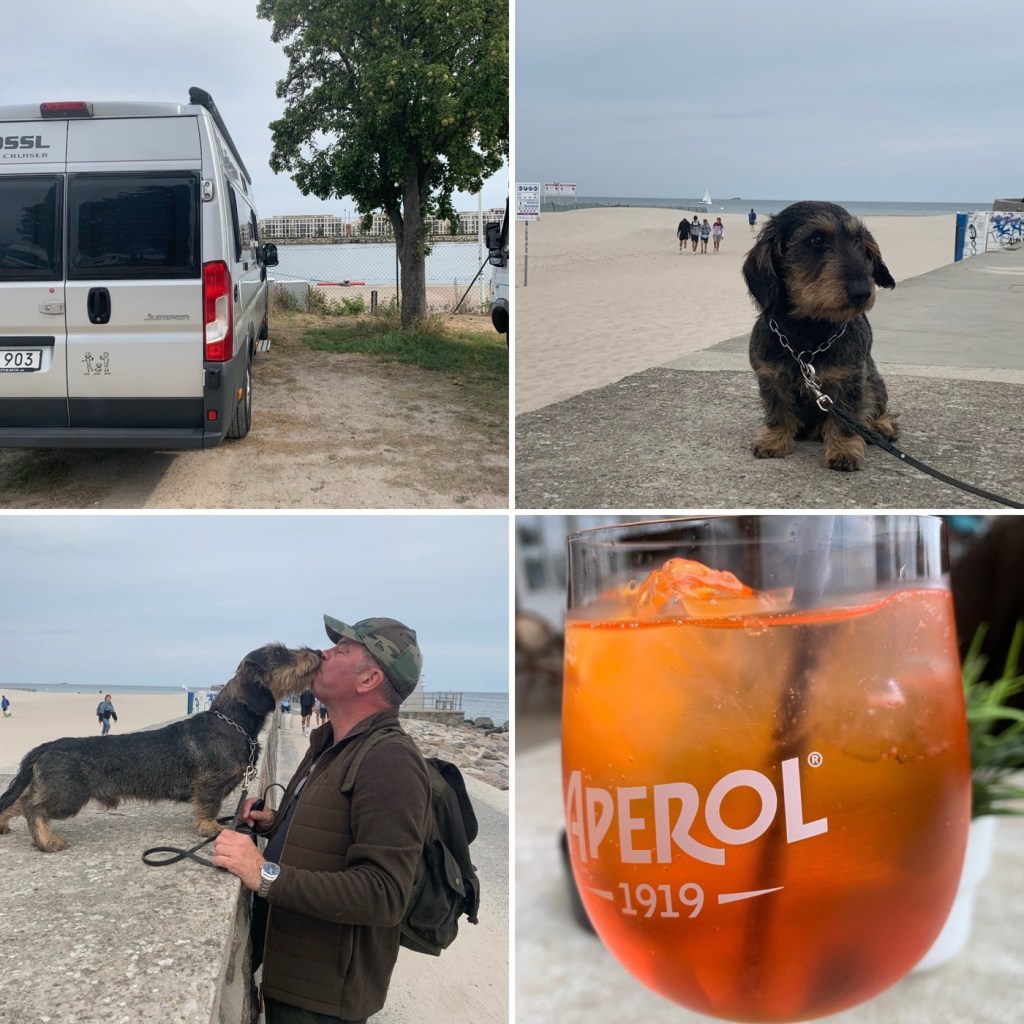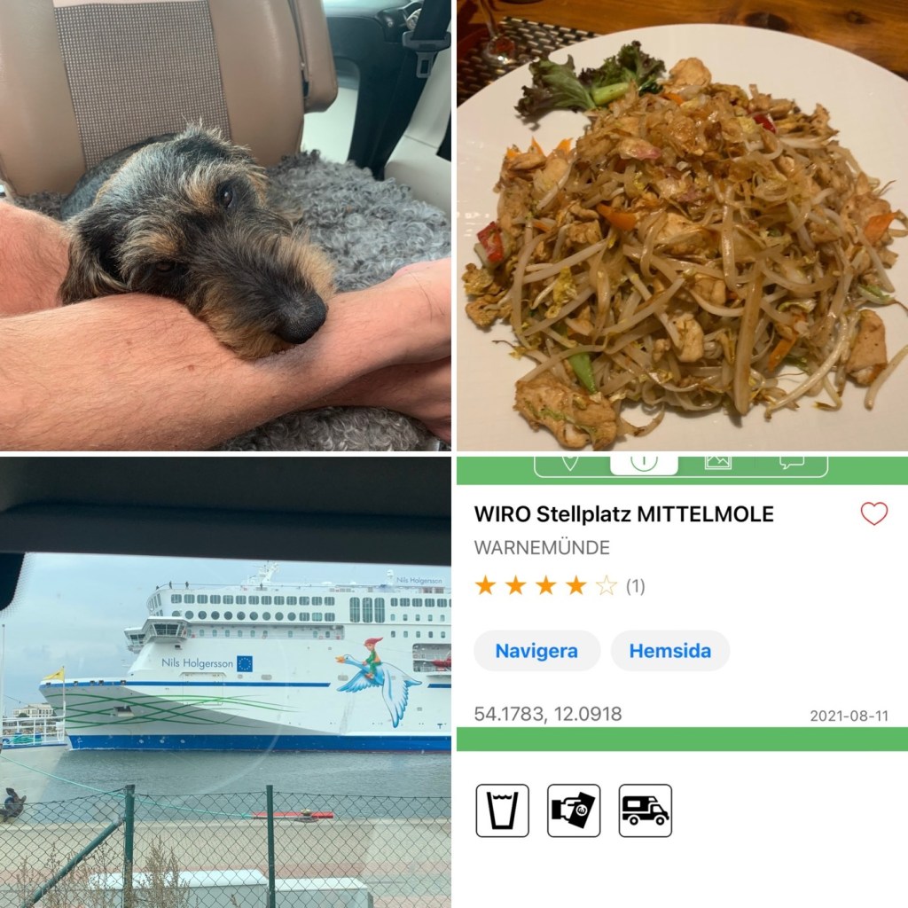 Endast töm i dag å sen avfärd mot Warnemünde. Frukost på rastplats. Framme vid 12, endast parkering för husbil, mångder av hbilar. Står att d önskar ej övernattning men d lär vi inte vara ensamma om att göra.