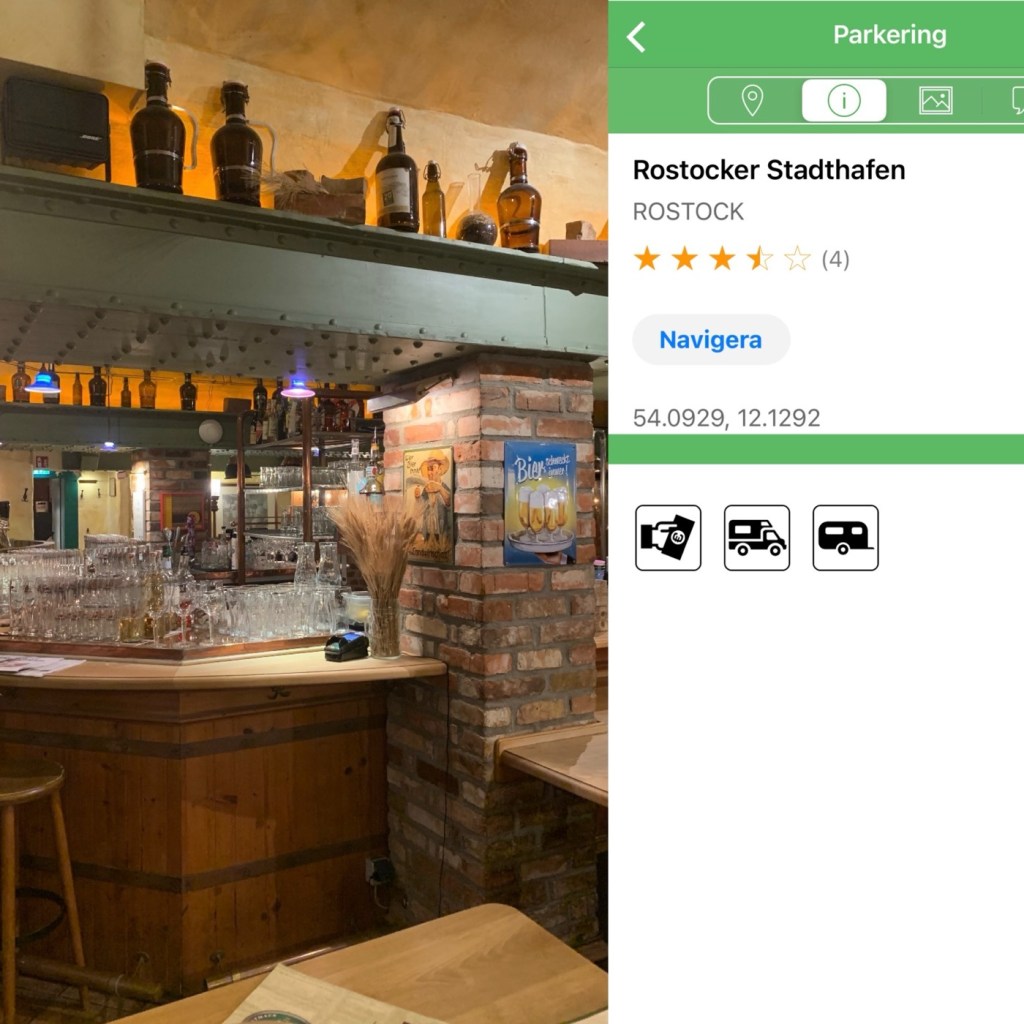 H väckte mig vid 9 med kaffe å Croissant. 14 km senare vid 11 tiden anländer vi till Rostock. Avgift 8-20