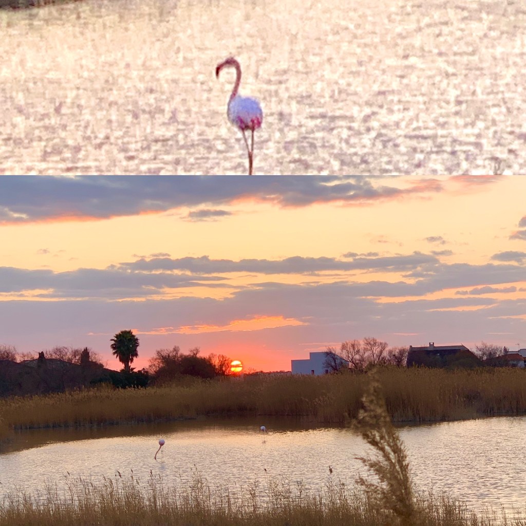 Går åter bilen vid 18, lagom till solnedgången, å då ser vi även flamingos 🦩