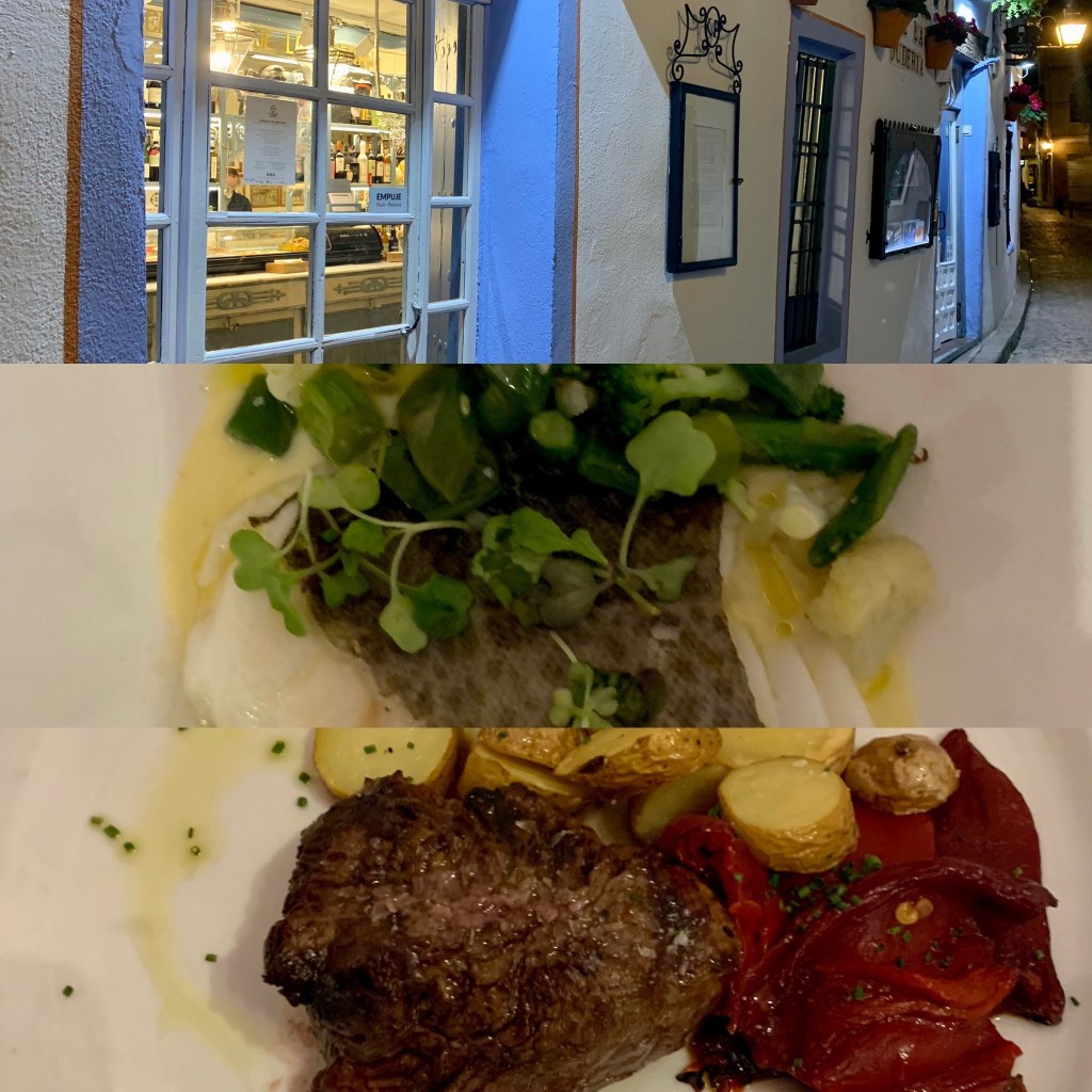 Hamnar tillslut på en restaurang som ser mysig ut. Jag tar fisk och H kött. Blev rätt dyrt i spanska mått mätt.