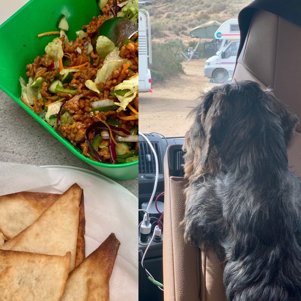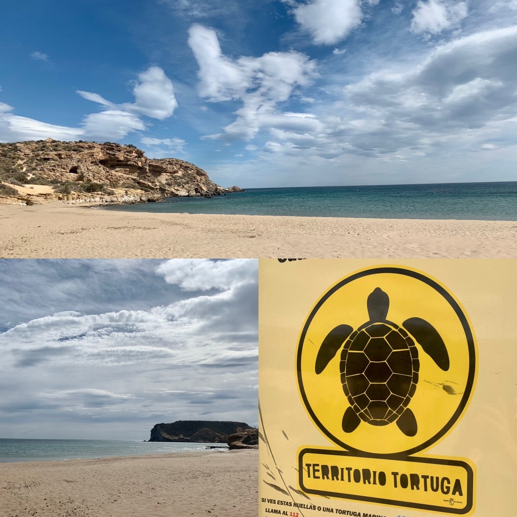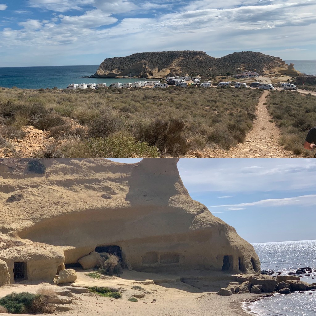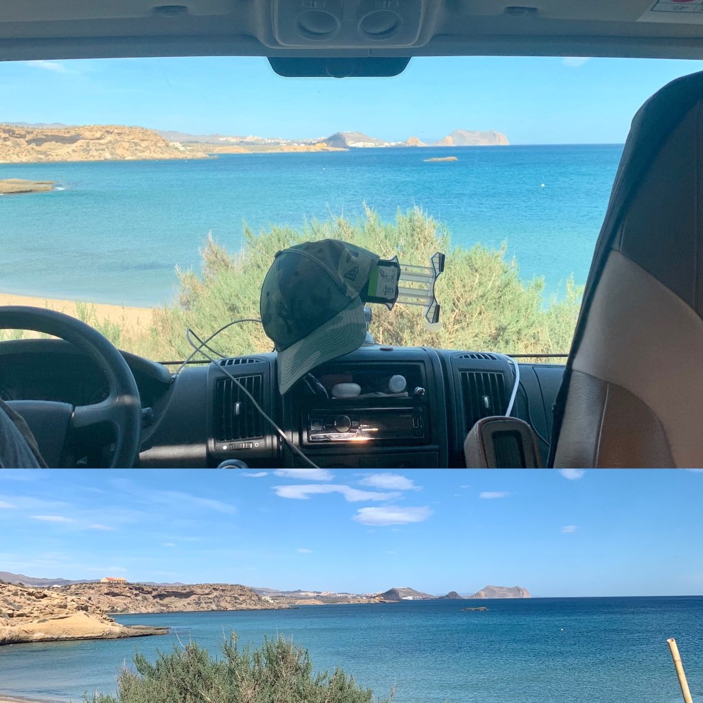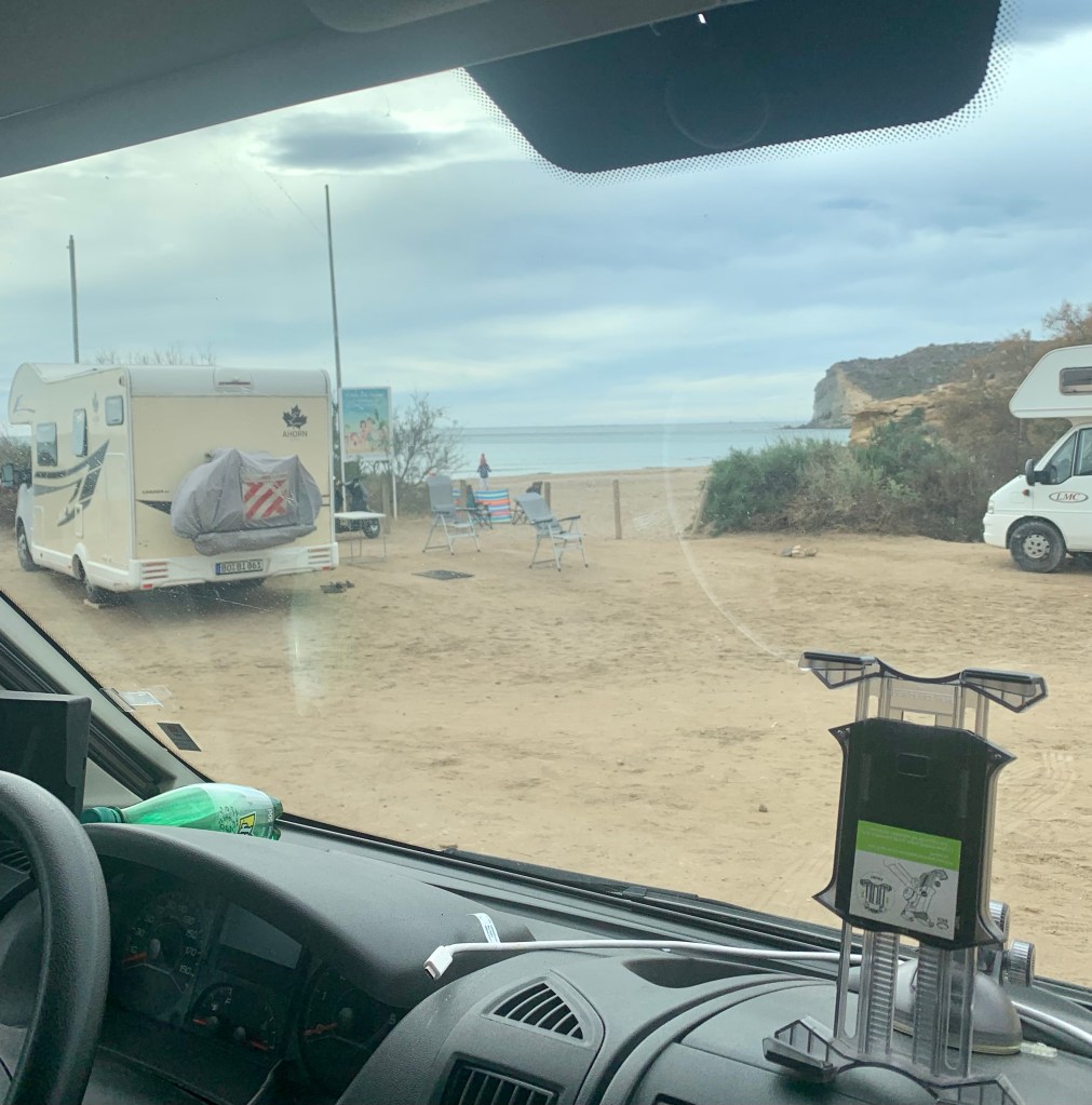 Avfärd vid 9. Kaffe å tostadastopp längs vägen. Framme på en strand söder om Aguilas, drar vi handbromsen vid 11. P-förbjuden för fordon över 5,40 i längd. Skulle nog tro att vi är ett av d minsta fordonen här.