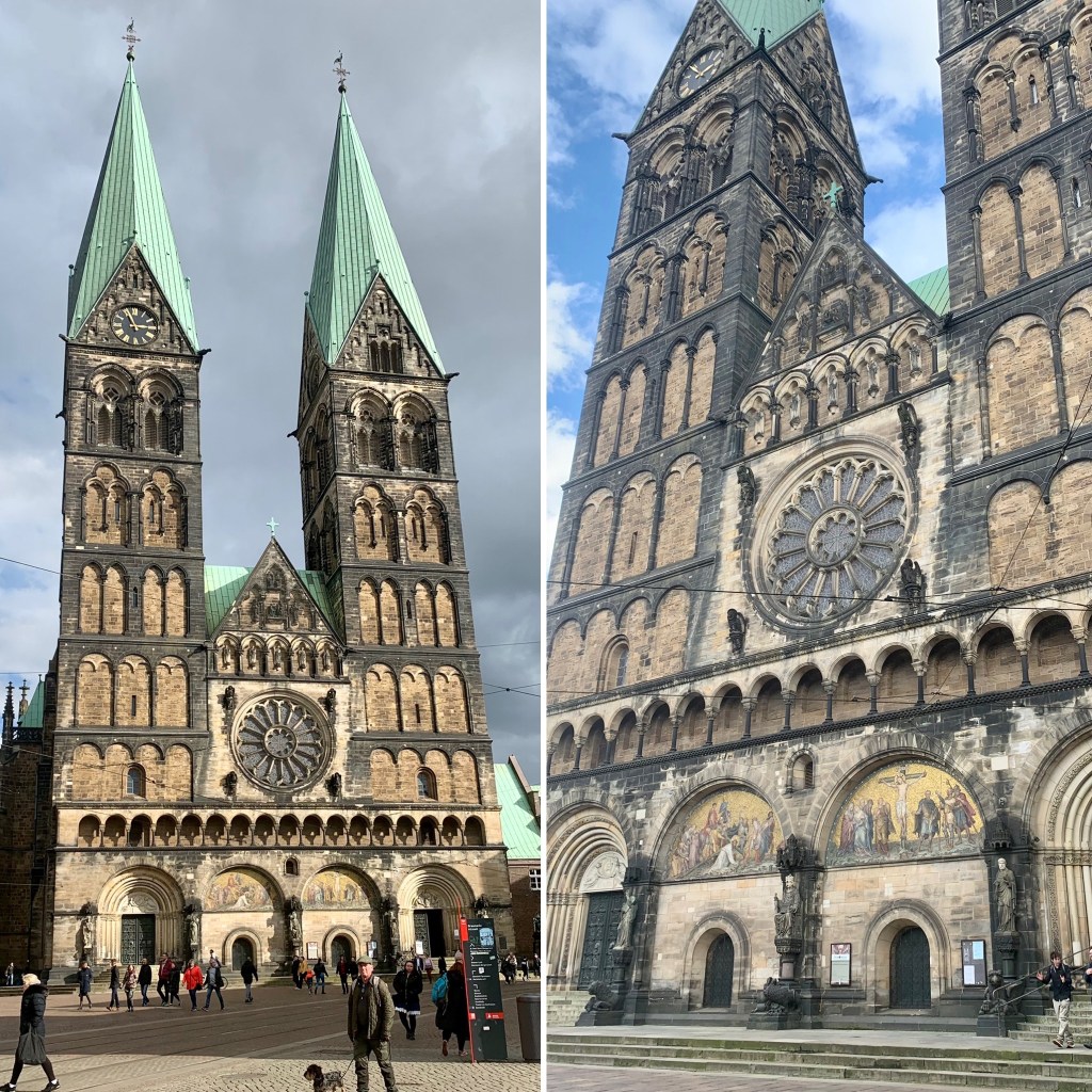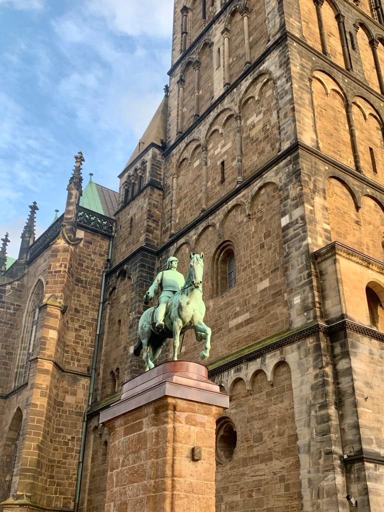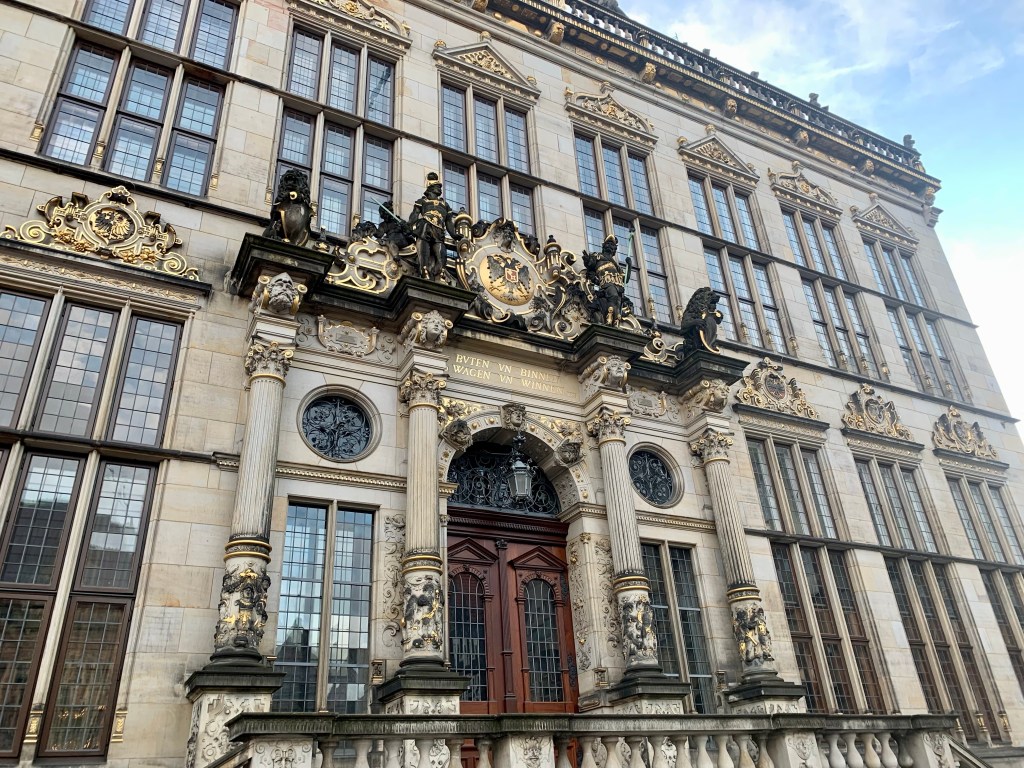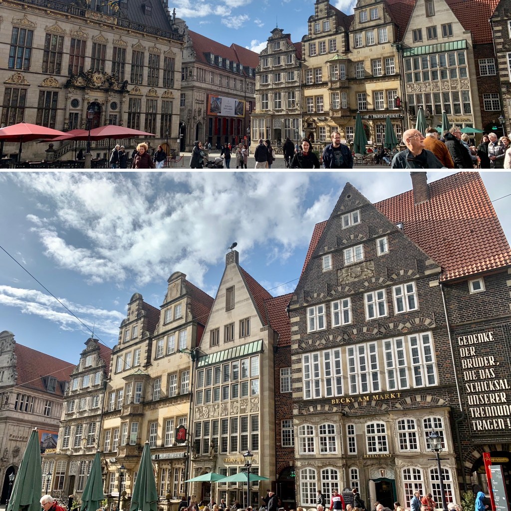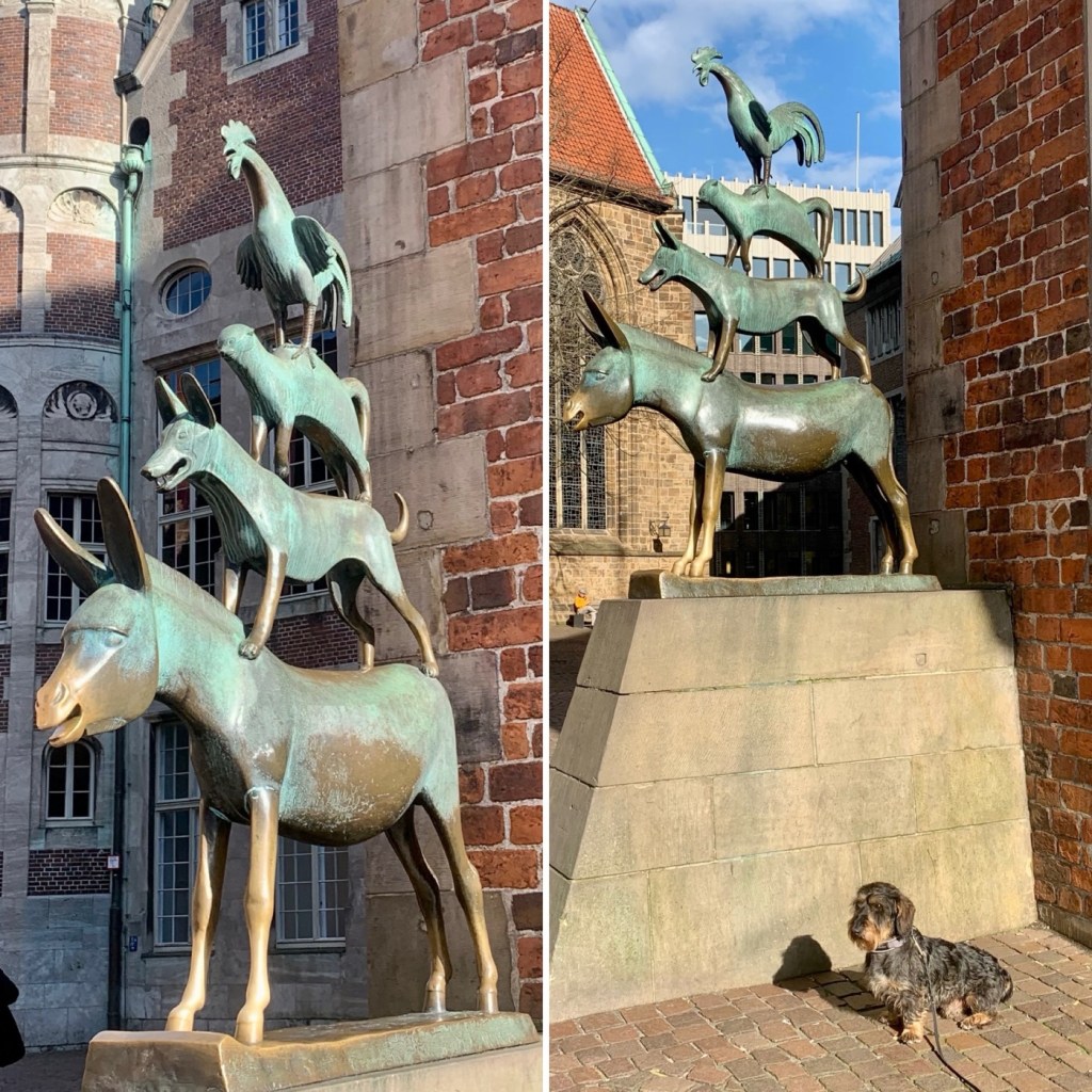 Skulpturen från Sagan om Stadsmusikanterna i Bremen, som skrämmer bort rövare står jämte rådhuset. Tycker nog den blev än finare med G