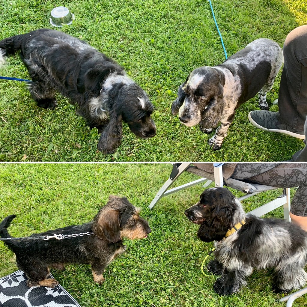 Syrran och svågern anländer vid 19. De har hundarna med sig till Gs stora lycka.