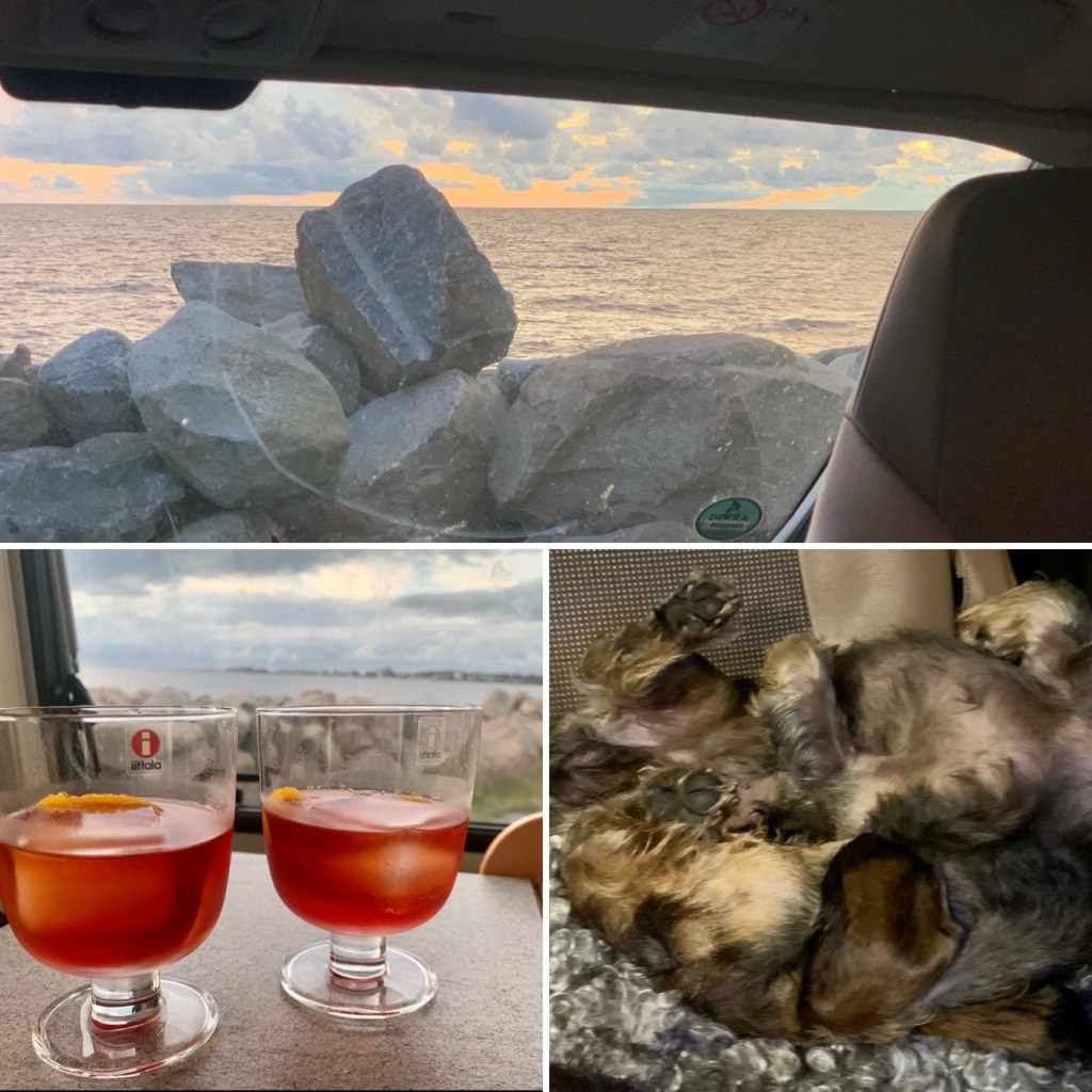 Hösten har ju med besked anlänt, och d mörknar tidigt, så känns onödigt att pynta sp avgift för natten. Drar därför handbromsen under propellrarna i Falkenberg strax innan 18. Skålar därefter in helgen med vår favoritdrink, Negroni