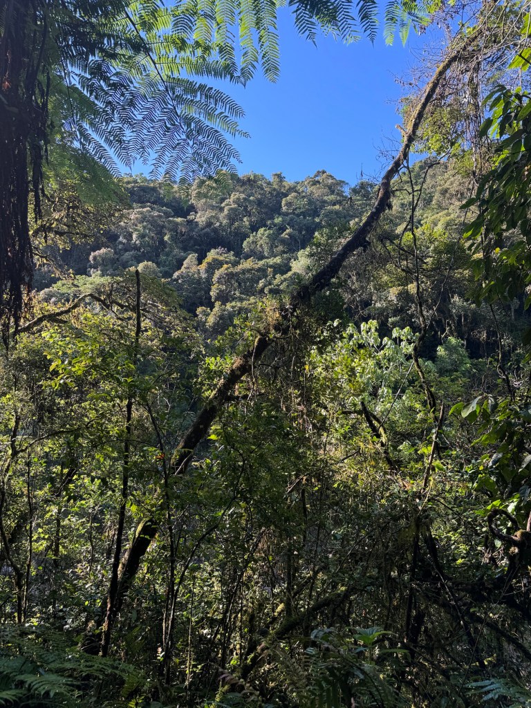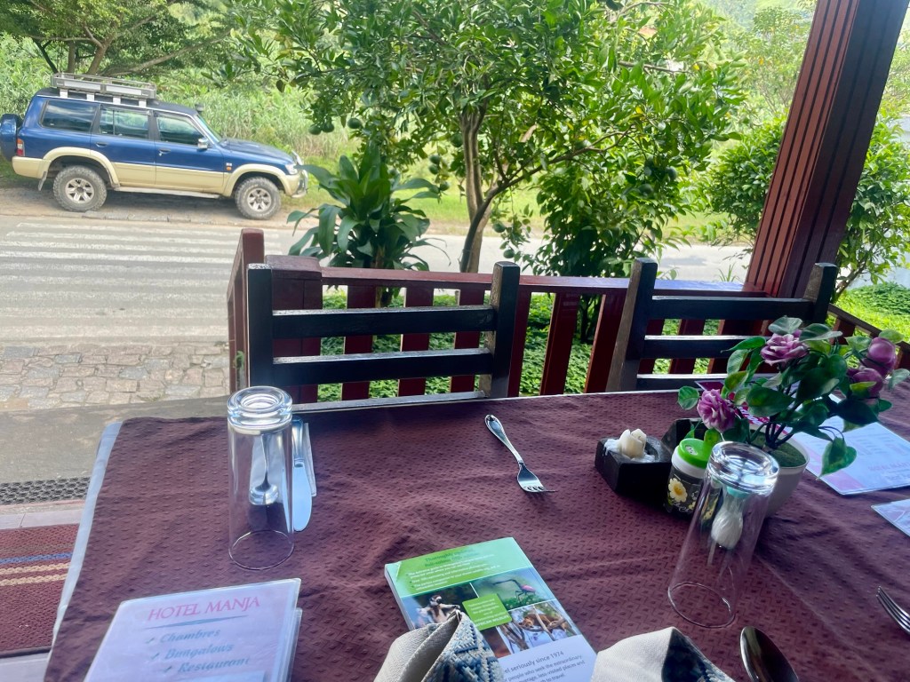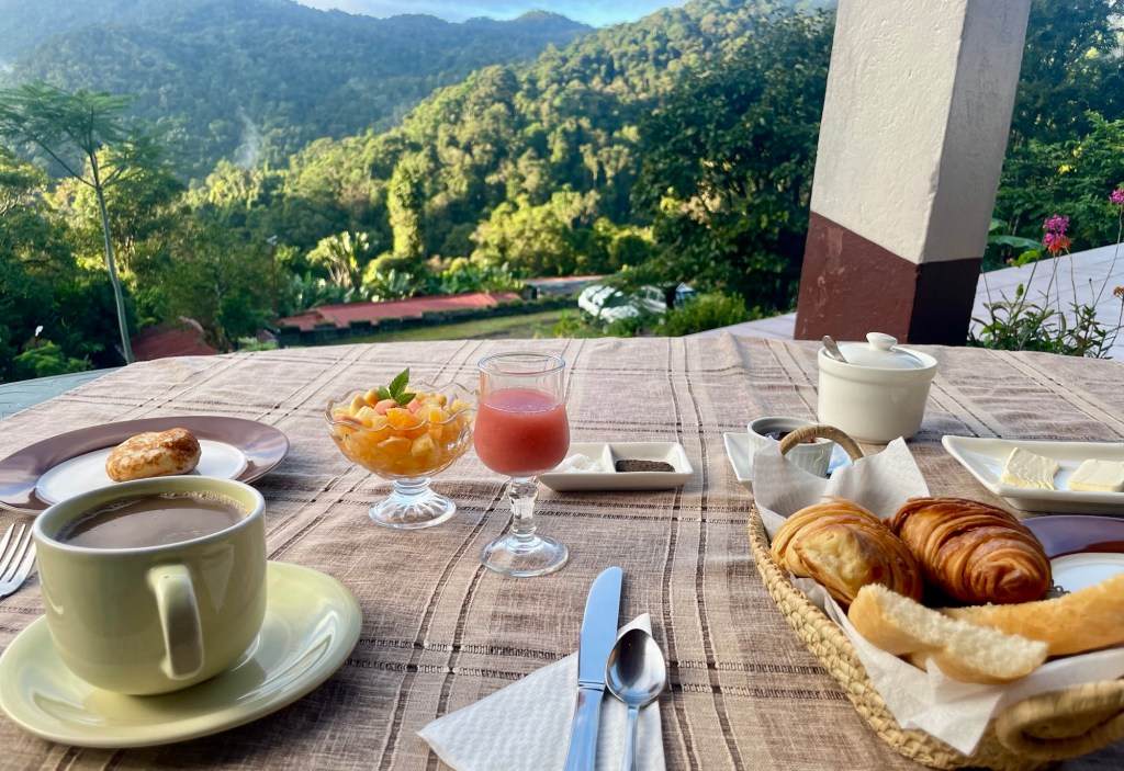 Startar dagen med frukost med underbar utsikt mot nationalparken Rinomafana. Vädret har klarnat upp sen natten och verkar lovande för dagens äventyr.