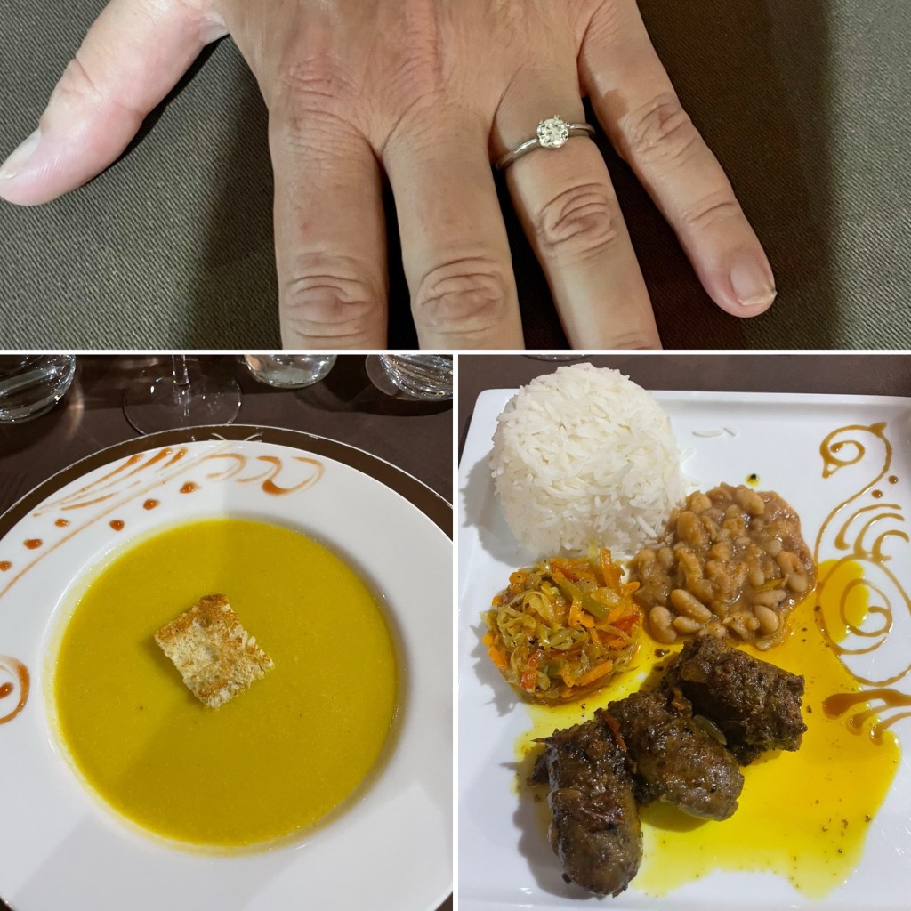 Pricken över allt var att middagen avslutades med frieri och ring 😍 vi är gifta sedan drygt 15 år, men tidigare frieri hade lite att önska när det gäller romantik, men här och nu: gör om gör rätt. Mina riktiga ringar har tyvärr gått förlorade, så nu en chans till att skaffa ny uppsättning, men det kollas på lite längre fram hemma i Sverige.