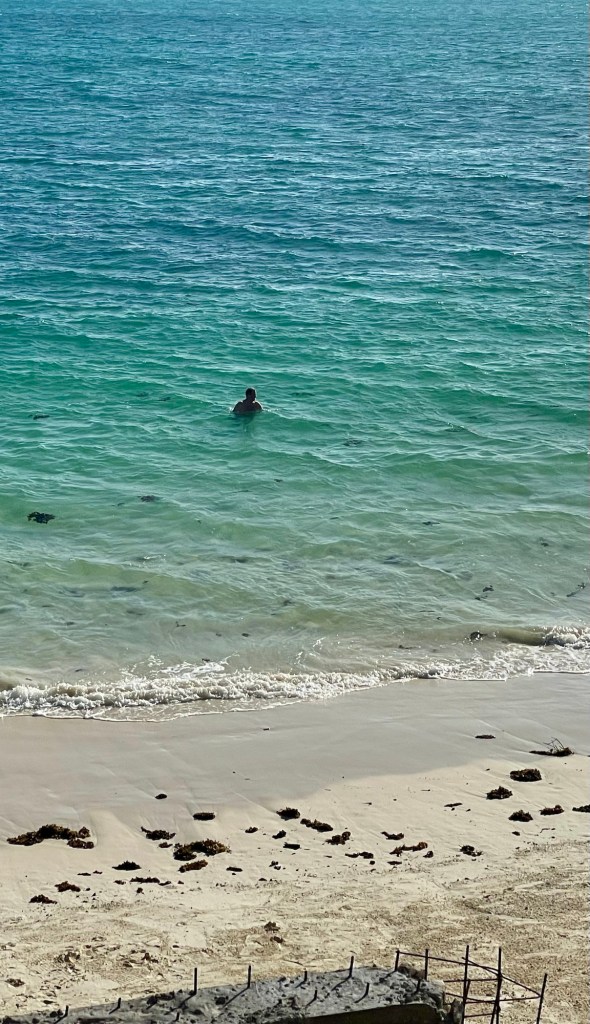 Åter rummet går jag ner och badar och tar samma strandpromenad som igår. När jag kommer åter kör vi ett gemensamt dopp.