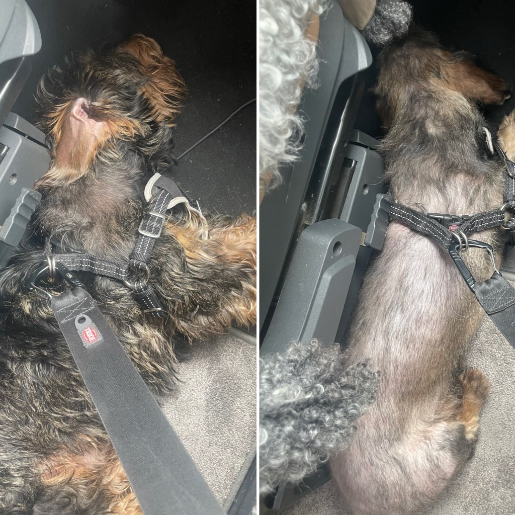 2 timmar senare hämtar vi upp nakenhunden. Är så ledsamt att hans hårlag är så bedrövligt