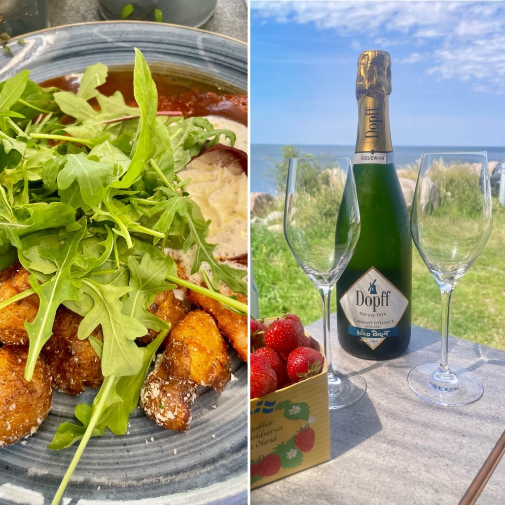 Möter sedan upp grabbarna på baren å skålar med ett glas cava. Jubilaren lämnar, men vi kör lunch på stan. Åter hemma blir det jordgubbar och Cremant som fått följa med från vår Alsace tur tidigare i år.