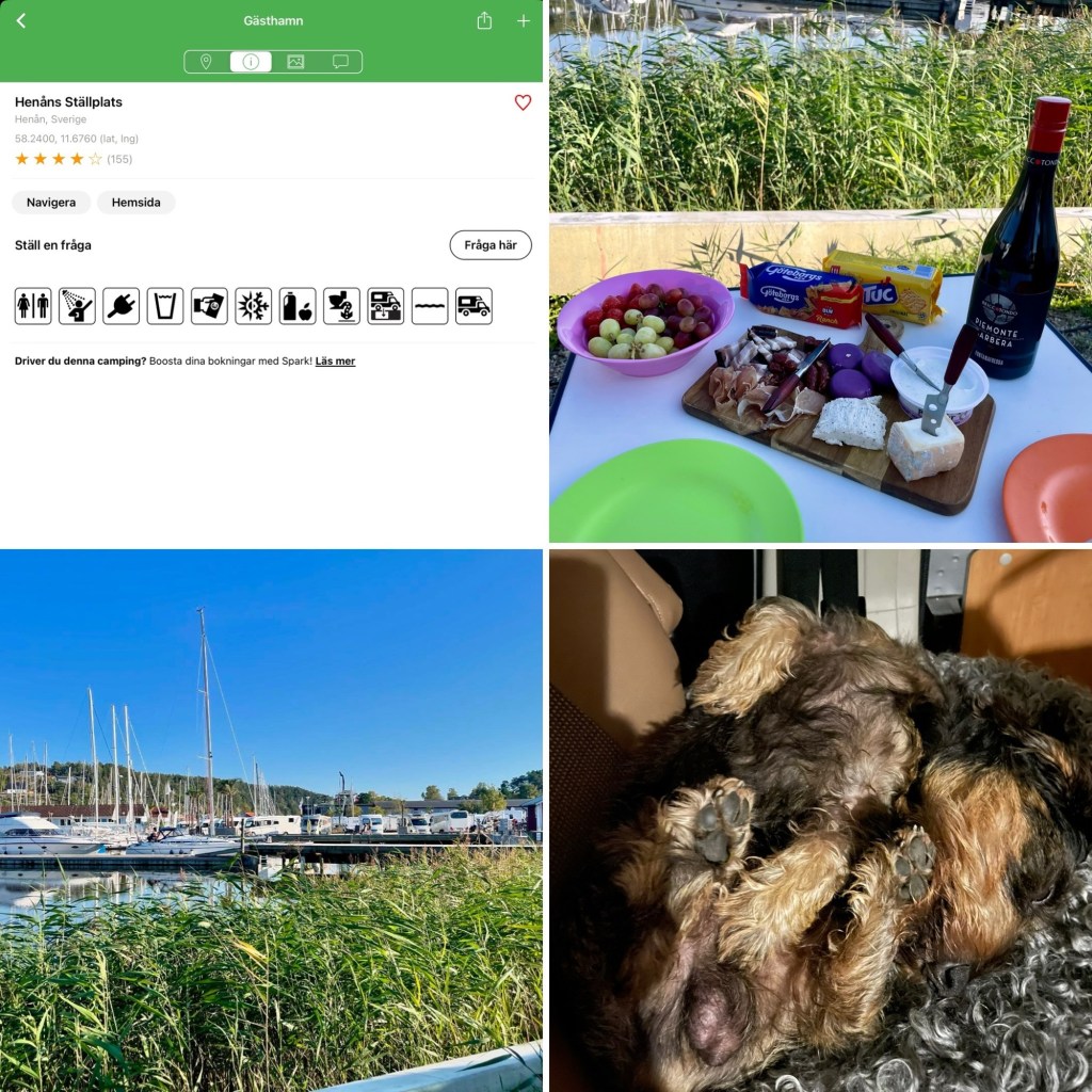 Kör till Henån, framme strax efter 15 å kniper sista platsen med sjöutsikt. Stolligt att så här sent på säsong att d är så många bilar.
