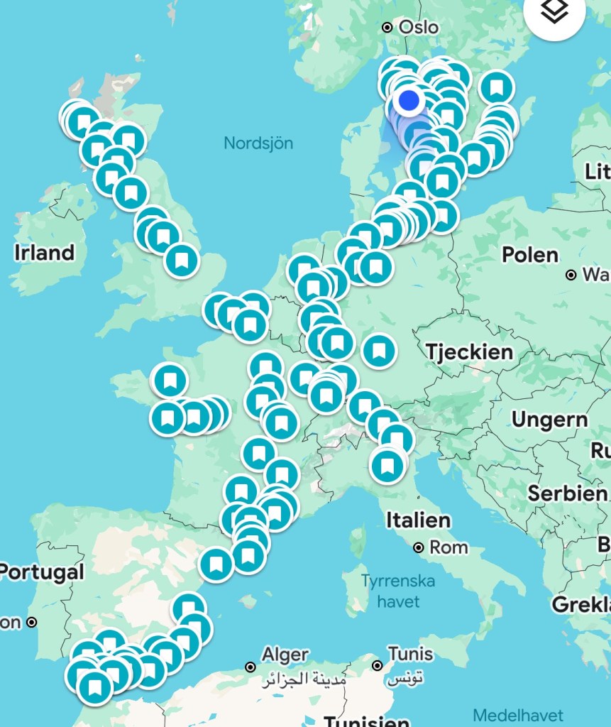 Även fixat till bloggen, så att den bli sökbar, samt fixat till en karta med pinn för alla stopp vi gjort med plåten sedan bloggen startat (mer pins kommer!)