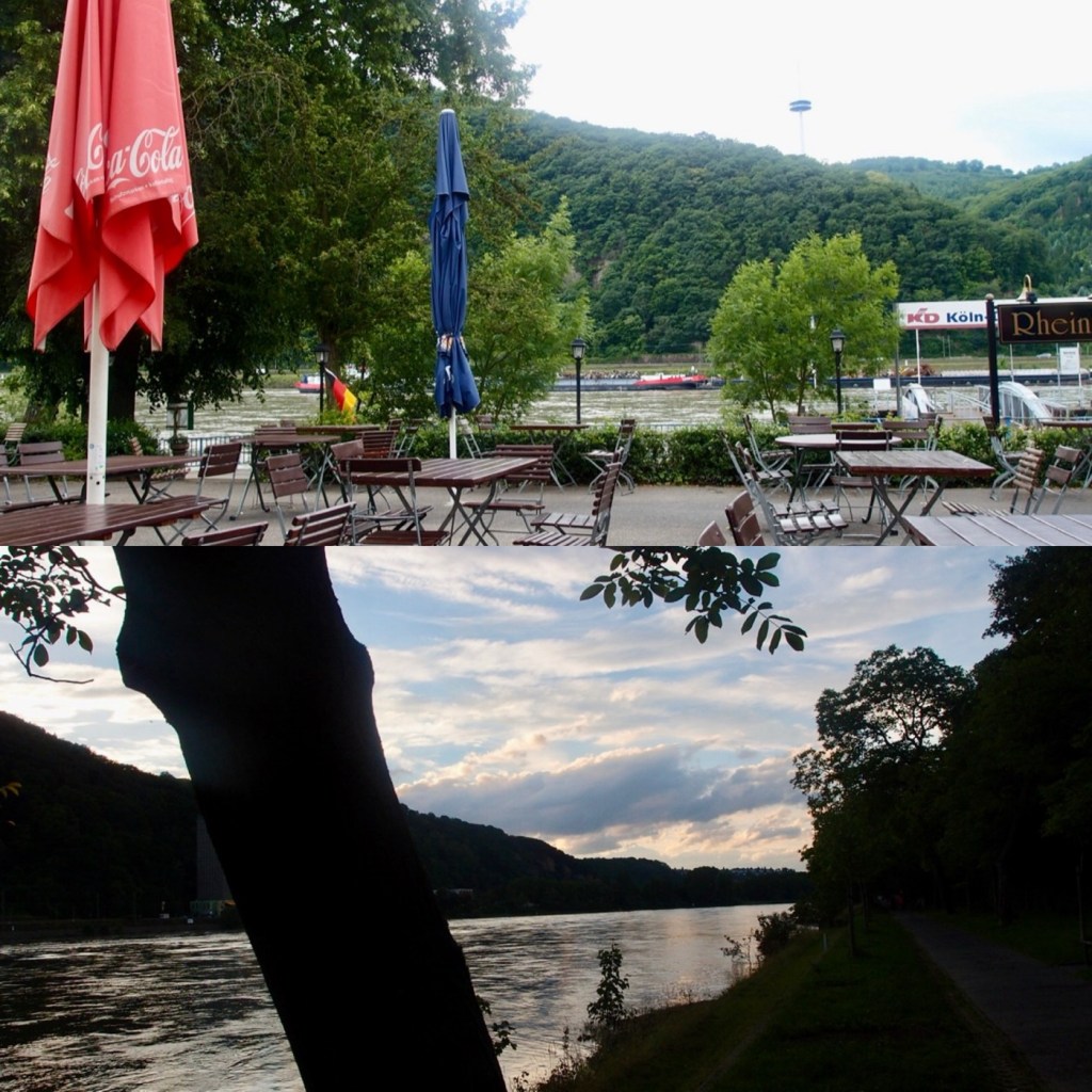 Fortsatte sedan färden, ställplats precis vid floden: guesthouse Reinterasse, där vi även käkar middag på kvällen. Enorma portionen, så även Ä blev proppmätt. Tar en kvällspromenad längs Rehn och kollar på godsbåtarna som far förbi.
