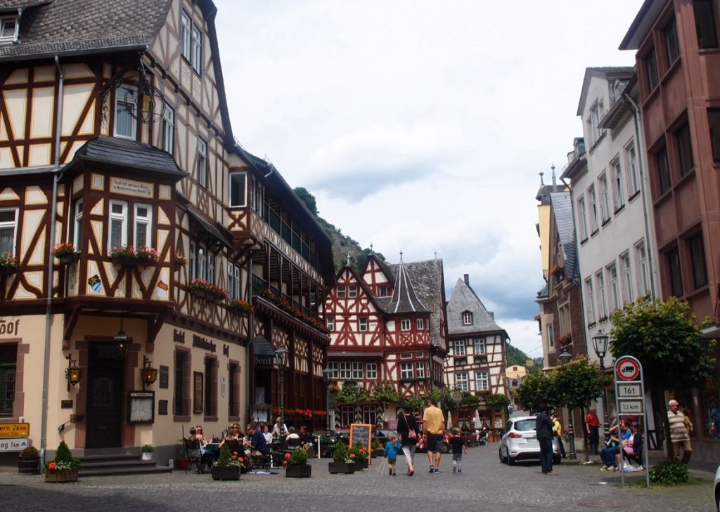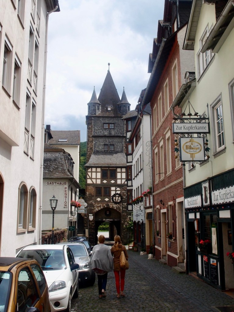 I Bacharach stannar vi för fika och en promenad längs den lilla stadsgatan. Denna gata har lite av allt, vi sett sedan tidigare, men i mycket litet format. Borgen ovanför, orkade vi inte ta oss till. I dag lördag var här bröllop i stadens kyrka, många välklädda gäster.