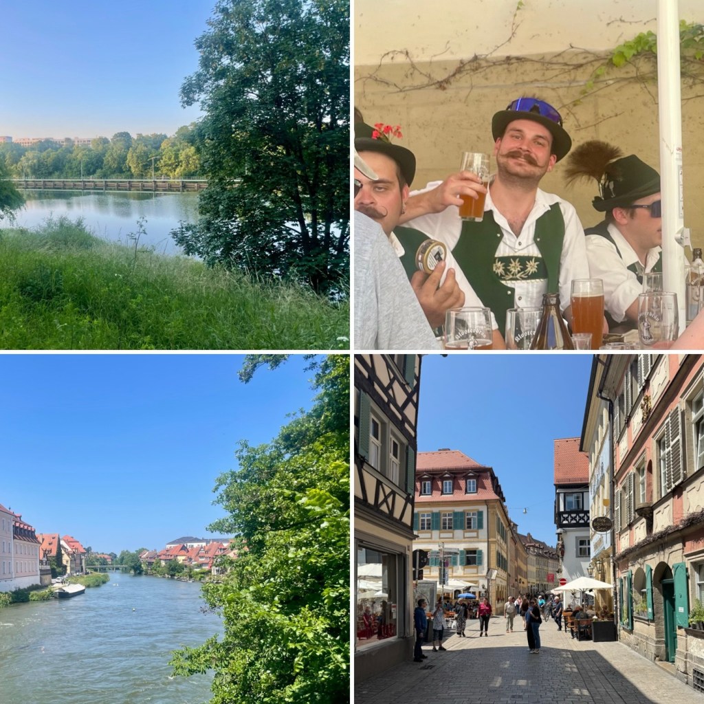 Rejält varmt, men vi knatade på. Tog en efterlängtad glass på torget. H köpte en keps, å sedan turistade vi i Gamla stan. Bamberg är känt för sitt rökta öl: Rauchbier – en speciell lokal ölstil där malten torkas över öppen eld. H parkerar sig på ett hak för att testa och jag gör ett besök på Käthe Wholfahrt.