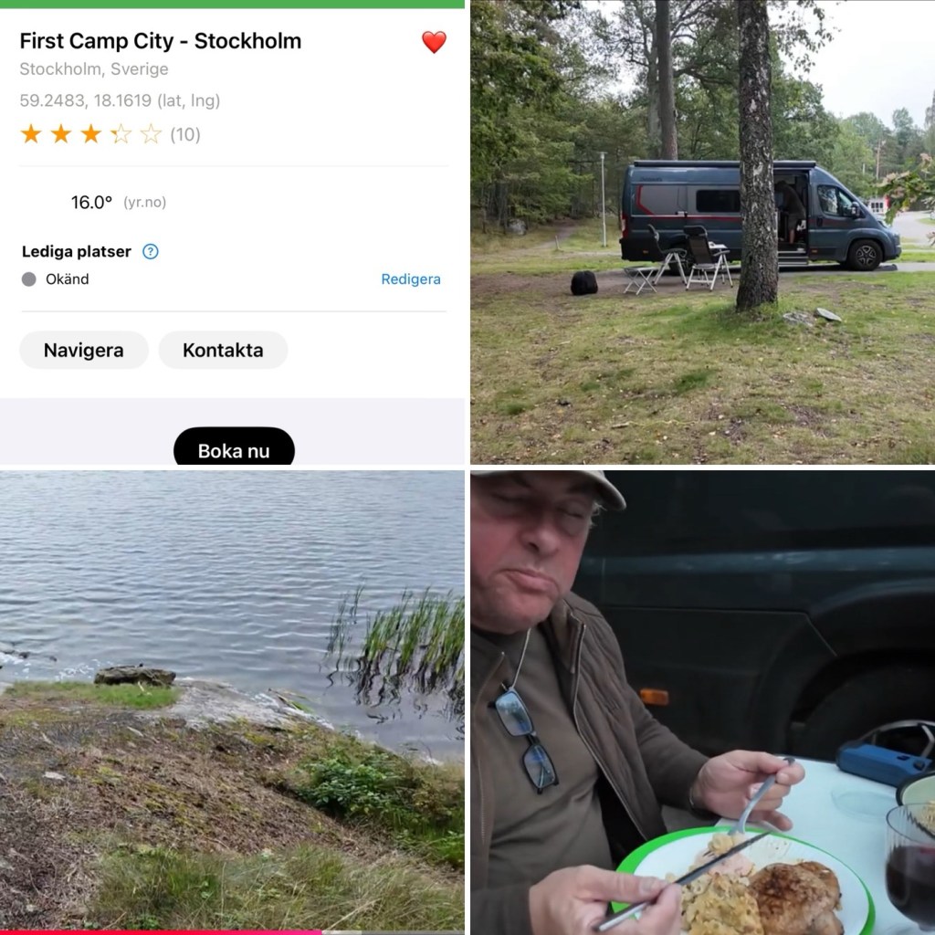 Tillbaka in mot stan, med övernattning på First Camp Stockholm. Vi knep sista platsen – en hörnplats till och med! Perfekt. Håkan styrde upp med nivåklossar & el 🔌 medan jag och Glenn tog en liten promenad 🐾.