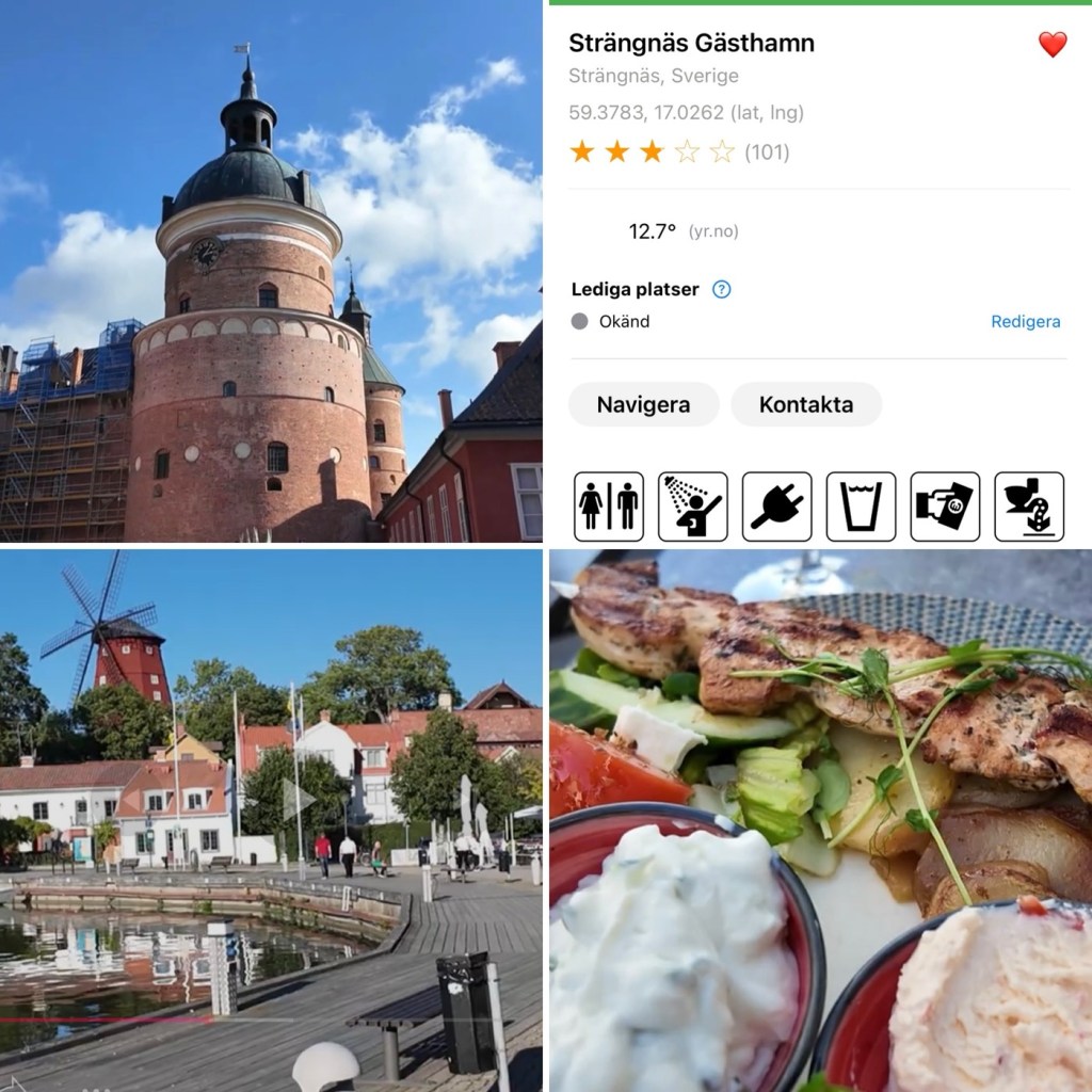 Visste inte direkt vart vi skulle därefter men vi hamnade i Strängnäs där vi knep en plats på en ställplats i hamnen. Dock visade det sig att man skulle bokat platsen och den vi valt var bokad. Löste sig då det fanns annan plats ledig. Ställplatsen låg intill en lekplats, så istället tog vi med oss varsitt glas ner till hamnen.